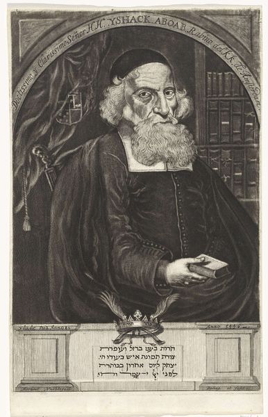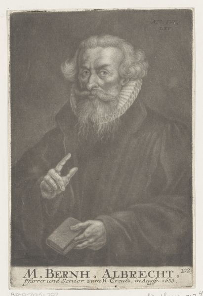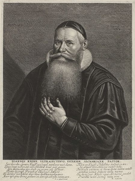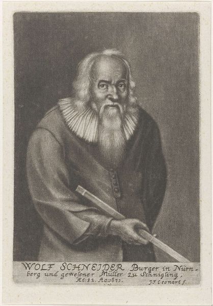 Curator: Here we have a striking engraving from 1669 entitled "Portret van een onbekende man, mogelijk Nicol. Grey of Caspar Pusch," created by Johann Friedrich Leonard. Editor: Wow, okay, first impression: intense. Those eyes... they feel like they’re drilling right into you. The whole thing has a sort of brooding, serious vibe, don't you think? Like he holds secrets or has just witnessed a tragedy. Curator: Indeed. As a portrait, it adheres to several conventions typical of the Dutch Golden Age. Notice the dark background that pushes the figure forward, creating an intimate viewing experience. Editor: Intimate is one word for it! Ha! It also kind of makes him look like he’s floating in the ether. And those hands, fiddling with what looks like a small stone or jewel—nervous energy or deliberate contemplation? I wonder what's he up to? Curator: That's what's so fascinating about portraiture, particularly from this period. While striving to capture a likeness, there's often a performance of social status or intellectual prowess. It's designed to communicate power, learning, or piety. Editor: Power, eh? I get more of a “wizened scholar grappling with existential dread” vibe, personally. His beard has serious gravitas, no doubt. What does this kind of black and white printing style do to portray character and stature? Curator: Engraving lends itself to detail. Here we see incredibly fine lines and subtle shading that creates volume and texture, essential in a portrait aimed at realism. The use of light and shadow emphasizes his features, the furrow of his brow, and as you said, those penetrating eyes. It captures what they thought were markers of individual identity. Editor: And the lack of color. It all lends to this somberness. And this level of detail suggests the portrayed character was known by somebody who knew their every hair, but instead we are stuck at 'anonymous portrait'! It just adds a mystery, don't you think? It could be anybody and that's interesting for the ages. Curator: Precisely. Anonymous portraits have a unique role, speaking to the broader societal types as well. This image circulates through time, open to new audiences and contexts far beyond its initial purpose. Editor: So it morphs and speaks a different language to different viewers. Amazing how a guy and his beard printed 350 years ago can get ya thinking.