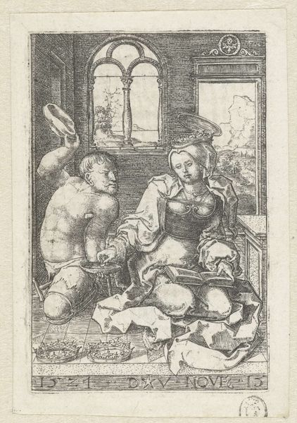 Curator: Before us is "The Knight and the Lady," an engraving by Master ES, likely created between 1445 and 1467. It's a fantastic example of early printmaking, currently housed here at the Metropolitan Museum of Art. Editor: My first impression is one of stark formality softened by a tender melancholy. The contrast between the rigid armor and the woman's gentle pose is striking. Curator: Absolutely. Considering the production, we should note the technical skill involved. Engraving at this time was incredibly labor-intensive. Each line had to be meticulously carved into a metal plate. This was hardly a democratic process; the tools, materials, and skilled labor were expensive. Editor: Yes, the politics of imagery were complex, weren't they? It makes you wonder about the intended audience and what this piece represented to them. This imagery connects with broader social and cultural norms, probably meant for the wealthy class. The attire suggests a narrative steeped in the values of chivalry and courtly love. Curator: The clothing gives a rich sense of period. The heavy plate armor of the knight with complex lines would require dedicated guilds and armorers, indicating specialized trades and distribution networks which are material evidence of burgeoning medieval commerce and courtly culture. Editor: I am wondering if this speaks to ideas around duty, sacrifice, and ideal relationships. Museums like the Met have really influenced our understanding. This engraving becomes part of the accepted story of this era and culture. But I am left wanting more: I would like to hear about who chose to memorialize that vision. What was omitted? Whose version is being amplified here? Curator: You’re spot on, it presents the world for that time and by someone during that time, revealing hierarchies, skills, labor division, consumption. As this engraving was printed repeatedly it influenced other engravers. It served a blueprint for visualizing courtly love in a commodified form that impacted societal and artisanal behaviors. Editor: Seeing how these materials and these forms speak volumes to me today— I now have questions beyond aesthetics, I would like to look at reception studies to examine audiences past and present and their diverse interpretations, making us richer when analyzing images as active participants. Curator: Definitely, by discussing production methods and then contrasting it to broader artistic and societal trends we both arrived at interesting aspects which go well beyond the sum of all lines and materials.