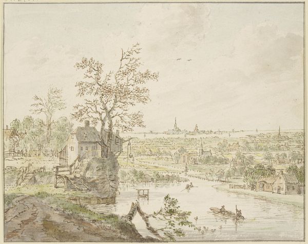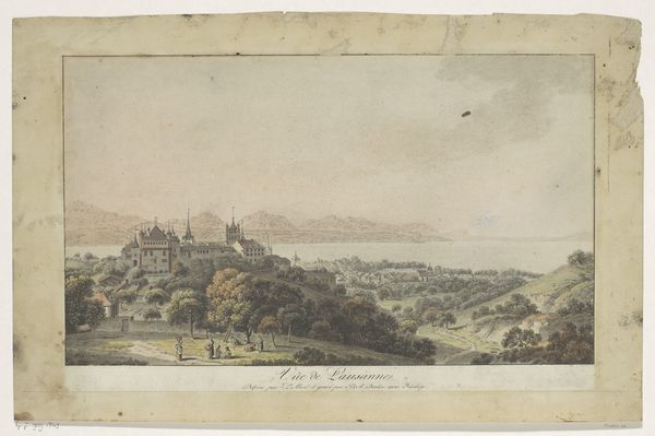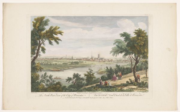 Curator: Looking at this 1753 print, “Gezicht op de stad Dublin gezien vanaf Phoenix Park”, reveals so much about how cityscapes were conceived and conveyed back then. Robert Sayer, the artist, captured this vista in meticulous detail. Editor: Oh, it's all delicate greens and hazy blues. Like looking at Dublin through a vintage postcard. I get a real sense of the leisure, everyone just taking a stroll, utterly undisturbed. The little figures feel staged, like actors in a tableau. Curator: Indeed. The placement of figures in the foreground wasn’t accidental. These elements, like the strolling family and grazing cattle, suggest both an Arcadian harmony and project British aristocratic land ownership. Think about the gaze itself – this isn’t just a portrait of a city, it’s an act of possessing it through sight. Editor: Makes you wonder what the "real" Dublin was like outside this curated gaze, right? This feels like a projection of how they wished it to be, this balanced ideal, almost burying the potential unrest simmering underneath the surface. All those tiny houses nestled so neatly - what stories are absent from this narrative? Curator: Absolutely. What strikes me most is how prints like this functioned almost as PR for burgeoning cities. Mass-produced engravings democratized access to views once only beheld by the privileged, reinforcing aspirations and colonial control in equal measure. They built an illusion. Editor: And those towering steeples on the horizon...a deliberate power play? Visually, they are imposing. Religion looking down upon the "mere mortals." This city, like many, seemingly founded on ideals literally out of reach. I still love the pastoral innocence, even if a bit illusory. It draws me right in! Curator: I agree! This image is powerful in the cultural memories that are retained within this single cityscape print, we glimpse not just Dublin's appearance, but also a vision of power, class, and even propaganda as perceived almost 300 years later. Editor: Right, a window, but also a mirror reflecting our present interpretations. This stroll through the past feels like a timely one.