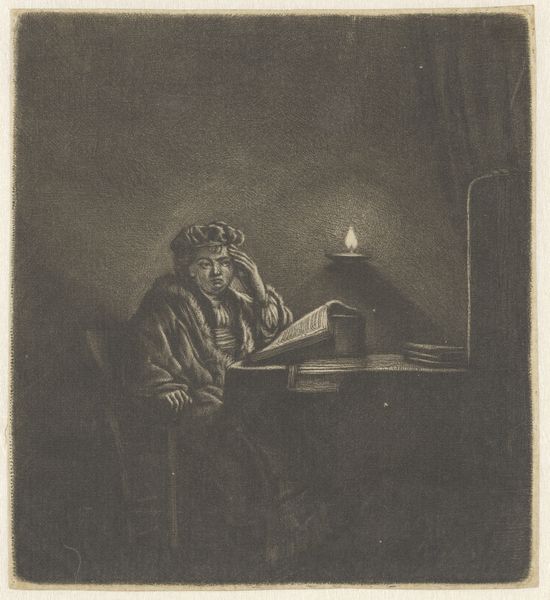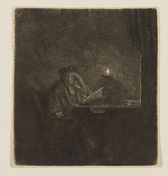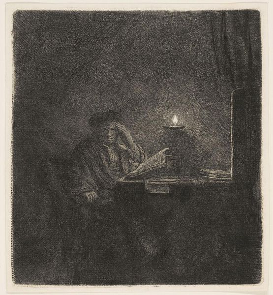 This etching, "Student at a table by candlelight," presents a somber scene dominated by dark tones, punctuated only by the flickering light of a single candle. The anonymous artist uses stark contrasts to create a powerful sense of depth and intimacy. The composition centers on the student, hunched over books, his figure emerging from the shadows. The candle serves not just as a light source but as a focal point, illuminating the student's face and drawing our eye to his contemplative posture. The surrounding darkness, achieved through dense cross-hatching, enhances the atmosphere of solitude and intellectual pursuit. The geometric arrangement of the table and books offers a structured counterpoint to the organic form of the student. This play of light and shadow, structure and form, evokes the philosophical debates of the era, where reason and enlightenment challenged traditional modes of thought. The artwork functions as a semiotic field, inviting us to interpret the signs of knowledge, isolation, and the quest for understanding.
