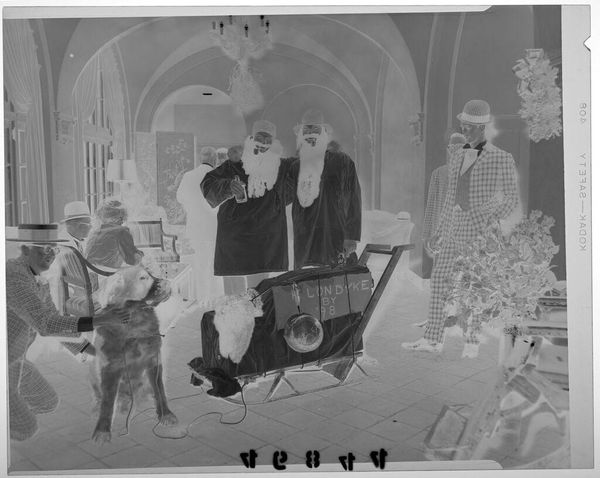 Editor: This is an untitled photograph by Martin Schweig depicting a bride walking down the aisle with her father. It's striking how the negative image alters our perception. What symbolic weight do you think this image carries, especially considering its inversion? Curator: The reversed image evokes a sense of memory, perhaps a reflection on societal expectations surrounding marriage. The bride and her father, central figures, become almost spectral, questioning the permanence and ideals associated with the wedding ritual. How does the negative space impact your understanding of their roles? Editor: It makes them seem less solid, more like echoes of tradition than individuals. The surrounding guests are also ghostly. Curator: Precisely. The inversion serves to destabilize the familiar, prompting us to examine the cultural script being enacted. What other symbols do you notice that might reinforce or challenge this reading? Editor: The flowers, the aisle markers... they're all part of this performance. I see how the inversion strips away the expected joy and reveals the underlying structure. Curator: The artist seems to invite us to explore the complex emotions and cultural baggage interwoven with such a significant life event. It's a powerful statement on the enduring power of symbols and our relationship to them.