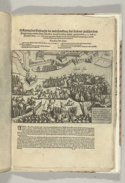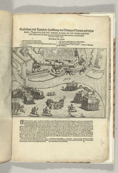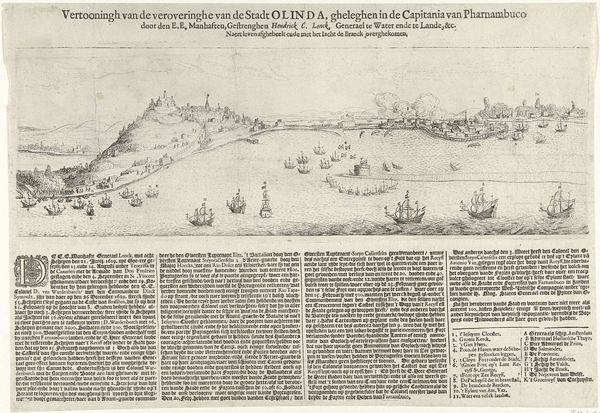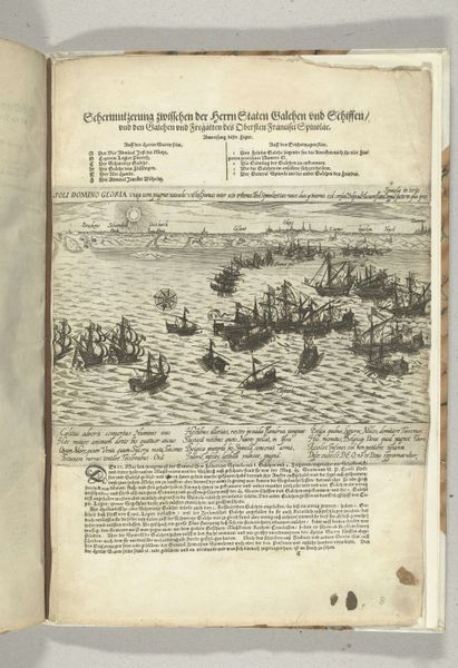 Curator: What a fascinating print! This piece, entitled "Vernietiging van Spaanse galeien, 3 oktober 1602," or "Destruction of Spanish Galleys, October 3, 1602" commemorates a historical naval battle. The piece itself dates from just after the event, sometime between 1602 and 1604, and is currently held here at the Rijksmuseum. What's your first impression of it? Editor: The whole thing reads like organized chaos, doesn't it? So many ships crammed into this little patch of sea—it makes me think of the sheer claustrophobia of naval warfare. And there's this intense feeling of confined action; it’s not an open, sweeping vista. Curator: Absolutely. And note the Baroque landscape style. It definitely enhances the drama. You know, landscapes, especially marine scenes, were increasingly popular as vehicles for narrative and historical painting during this era. So it's not just a seascape, it's history in action. Editor: What’s striking is how everything is so meticulously rendered. You can practically count the cannons. Is this focus on detail intended to glorify military precision? Curator: That's perceptive. Details matter, and their meticulous rendering here almost sanctifies Dutch naval might. The event itself—the Dutch victory—was critical in establishing their power. You can see those tiny flags as visual proof of triumph. Editor: Those flags become symbols then, right? Assertions of cultural identity and expanding power. Curator: Indeed. Notice the overall composition. The ships aren't randomly scattered; the placement creates diagonals, directing our eyes to points of engagement and emphasizing the organized nature of the Dutch fleet. There are definitely symbols loaded in. Editor: It's as though the artist is deliberately staging this maritime theater, turning a messy, violent event into a structured display of Dutch heroism. The use of print – the multiple available copies– makes it accessible for broad consumption, it helps to spread and consolidate such national heroic accounts. It is fascinating to see how the combination of chaos and a well-structured image ends up speaking of power, even in defeat. Curator: Yes! It’s about crafting and sharing a particular story for generations to come, what we today could call 'visual propaganda'. Editor: Absolutely. An enduring visual representation of Dutch maritime strength, and a fascinating piece of history, told on paper. Curator: A tiny time capsule for national pride, quite powerful, considering it’s just ink on paper!