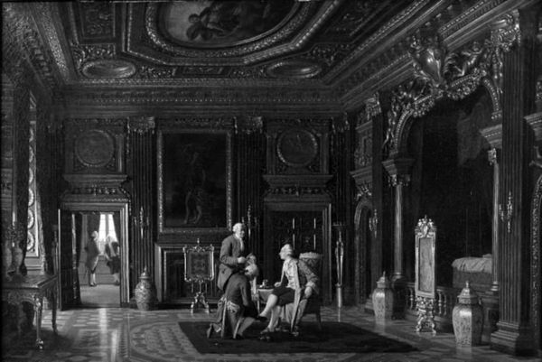 Editor: This is Heinrich Hansen’s “Christian IV's Audience Chamber at Rosenborg Palace, Copenhagen” painted in 1854 using oil on canvas. The detail is impressive, but it feels a little staged to me, like a set piece. What do you see in this work? Curator: It is staged, but that is not a detriment! The work can be interpreted as a visual document that performs specific cultural work. Hansen, working in 1854, is depicting an interior that, by then, was already deeply symbolic. Rosenborg Palace represented a specific era of Danish power and cultural flourishing under Christian IV. How does Hansen frame the narrative? Editor: Well, the figures are small, almost secondary to the architecture. The light streams in, highlighting the grandeur of the room itself. Curator: Exactly! It is less about individual agency and more about the enduring power of the monarchy and the historical narratives it embodies. Consider the context: this was a period of national romanticism. Artists aimed to create visual representations of an idealized past to foster national identity. Who do you think would commission such an artwork and why? Editor: Probably someone from the upper class. This painting would solidify a certain view of history and the monarchy. Is the detail significant here? Curator: Precisely, look at all those paintings and ornaments, the artist is going to extreme lengths to idealize the royal family, suggesting wealth, power and influence that serves the cultural elite of the time. Hansen invites viewers to reflect on their own place within this narrative. It almost makes you wonder whether this is just glorification of authority figures from the past! What do you think about that? Editor: It's true, seeing it this way, it challenges the artwork’s intentions beyond the surface, which could prompt deeper discussions. Curator: Exactly! It reminds us that art isn’t just about aesthetics. It's about the power dynamics, social structures, and narratives it reproduces or challenges. Editor: Thank you! It really opens up a different dimension for understanding art's role in society.