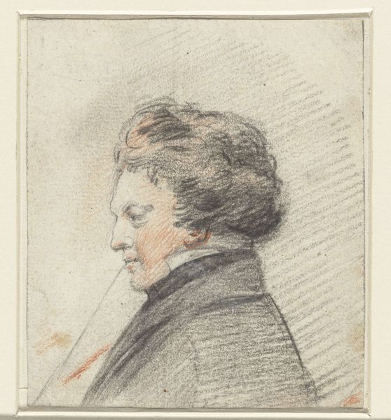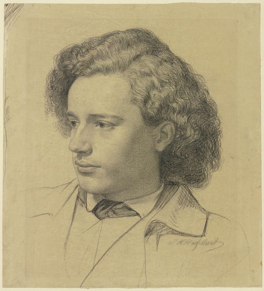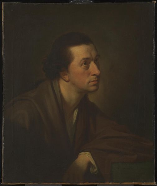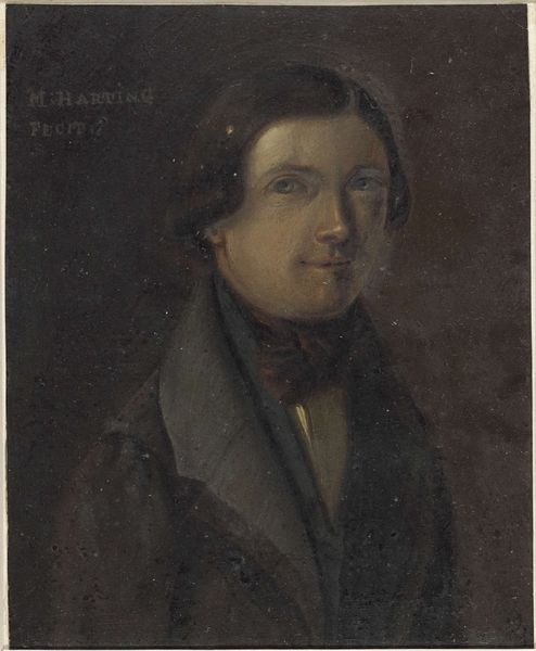 Curator: This is A Painter’s Self-Portrait, thought to be from the British School of the 19th century, currently residing here at the Tate. Editor: The first thing that strikes me is the artist's gaze; it feels intensely self-aware, almost challenging. Curator: Notice how the composition balances dark, almost brooding tones with a luminous face. This contrast creates a dynamic visual tension. Editor: Indeed. The palette he holds, splashed with color, symbolizes the potential for creation, a potent emblem of the artist's inner world. Curator: The brushstrokes, while not overtly expressive, build form meticulously. There's a rigor to the structure that anchors the emotional intensity. Editor: To me, this self-portrait is more than a likeness. It’s an exploration of the artistic identity, fraught with the burdens and joys of creation. Curator: A fascinating synthesis of control and raw feeling, it invites us to reflect on how painters perceive themselves and their role. Editor: Yes, and how we, as viewers, project our own ideas of art onto their image.