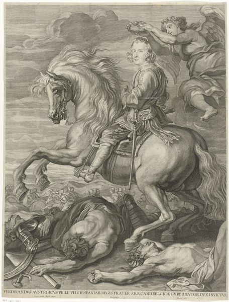 Luca Giordano painted this dynamic portrait of Charles II, King of Spain, on horseback, likely during the late 17th century. The composition immediately strikes us with its theatricality. Charles is elevated, both literally and figuratively, above a chaotic scene of battle, while an allegorical figure hovers above, bestowing divine approval. Giordano masterfully uses the baroque techniques of dynamic movement and diagonal composition to convey a sense of power and divine right. Notice how the rearing horse and the king's confident posture direct our gaze upwards to the figure in the clouds, reinforcing the hierarchical structure. This use of space and form serves not only to depict Charles as a ruler but also to legitimize his authority through visual cues. The sweeping brushstrokes and vibrant colors add to the dramatic effect, creating a spectacle designed to impress upon the viewer the grandeur and legitimacy of Spanish royalty. The painting presents a complex interplay between earthly power and divine justification, a theme that continues to invite our interpretation.