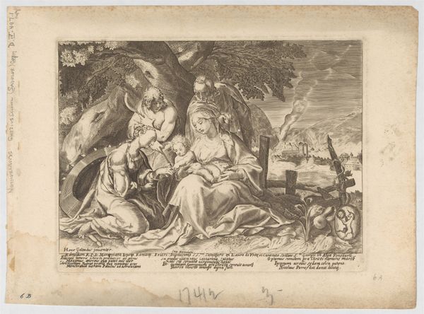 Léopold Flameng created this etching called Christus en Maria met moeders en spelende kinderen, or Christ and Mary with mothers and playing children, sometime between 1831 and 1911. The image offers a glimpse into 19th-century social ideals surrounding motherhood and childhood, but also the religious underpinnings of those ideals. The artwork depicts mothers with their children in an idyllic outdoor setting. At the center, Christ and Mary are floating on a cloud, blessing the scene. There's a strong emphasis on the innocence and purity of children, as they’re shown playing and interacting freely. The mothers appear serene and nurturing, embodying the era's expectations of women as caregivers. Flameng creates an emotional connection between the earthly realm of motherhood and the divine blessing of Christ and Mary. He invites reflection on the values of family, faith, and the role of women in society. The image blends the sacred with the everyday, reminding us of the human desire to find divinity in our ordinary lives.