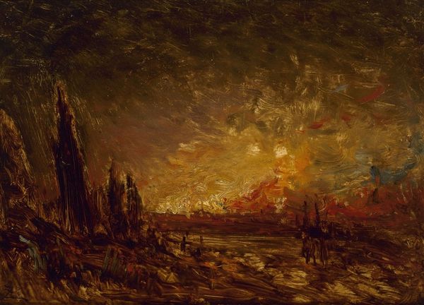 Curator: This dramatic oil painting is entitled "The Annual Girandola at the Castel Sant’Angelo, Rome" by Joseph Wright of Derby. There's no exact date assigned, but it places us firmly within the late 18th-century sensibility. Editor: It strikes me as surprisingly theatrical. That towering tree in the foreground seems like it's been strategically placed on a stage set, drawing your eye towards the spectacle of the distant fireworks. There is an underlying somber quality despite the festivities; the colors are quite subdued. Curator: The painting really captures the essence of the Girandola, an annual fireworks display in Rome. Consider it not merely a depiction of fireworks but the representation of continuity, perhaps the symbolic victory of light over the darkness. You can see how it highlights both the grandeur and transience associated with Rome, its empire, and the church, now expressed as sheer display. Editor: I'm immediately drawn to how Wright uses light to articulate power dynamics. While it is undoubtedly about beauty and spectacle, it also seems to quietly comment on how authority stages these large displays of control. Curator: Exactly, and this moment ties into larger issues present during the time. He painted in the period known as the Grand Tour. Think of Wright, therefore, processing his own understanding of how culture and power converge, both within and beyond Italy. The dark and prominent trees in the front add a stark quality and a sense of mystery. The fireworks exploding, as a motif, remind the viewer of the ephemeral nature of celebration itself. Editor: Precisely, the use of shadow is as potent as the illumination itself. Perhaps it's suggestive of a nuanced awareness of what lay beneath the spectacle of empire and faith – alluding to those obscured by history. Even more so, the ordinary residents who exist beyond the showy exhibition? The work almost serves as an inquiry on the cost of the grandiose nature of such displays. Curator: That shadow evokes deeper meanings. It leaves us contemplating the nature of power, its presentation, and how these images persist over time. Editor: It is fascinating how much a "pretty picture" can reveal about history’s darker corners and continue to be a conversation starter about those themes even today.
