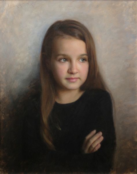 Editor: This is Robert Henri’s 1922 oil painting, Bernadita. She has a very direct, engaging gaze, and the dark background makes her the absolute focal point. What elements of its composition stand out to you? Curator: The masterful employment of chiaroscuro immediately captures my attention. Notice how Henri uses light and shadow to sculpt Bernadita’s face. The areas of illumination define her features and the shadows establish the underlying structure. Observe the chromatic relationships in her clothing and complexion: shades of rose against a pale skin. Editor: It’s almost theatrical, the way the light singles her out. I'm intrigued by the red shades that he utilizes. Is this simply representational, or could the colour be acting as a symbolic code here? Curator: Interesting proposition. Formally, the application of the red enhances her appearance. Observe the way that this element, which dominates our view in its position beneath her neck, interacts with the dark areas that dominate the image to contribute a dramatic quality. Would you consider it to dominate your perspective? Editor: I do agree, particularly at first. How did the Ashcan School’s aesthetic thinking contribute to this dramatic effect, if at all? Curator: Note how the portrait abandons conventional, posed representations in favour of an emphasis on capturing the essence and immediacy of the subject, in all elements and colours within. There is rawness; notice, especially, the bold, visible brushstrokes. They create a texture, a certain sense of unfiltered realism. This artwork, a product of an aesthetics focused upon realistic artistic and aesthetic representations, attempts to capture that aesthetic thinking. The structural choices communicate to us a dramatic, rather stark and striking work of realism. Editor: So, through formal choices, Henri presents the subject without romanticizing or idealizing her? Curator: Precisely. It showcases the essence and spirit rather than embellishment. This understanding impacts our knowledge on realism and portraiture. Editor: Definitely insightful. The close reading provides a greater grasp on the painting itself and the cultural elements influencing the construction of its elements.