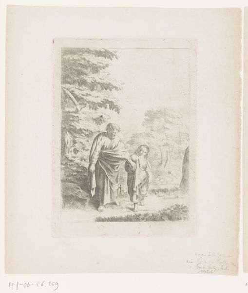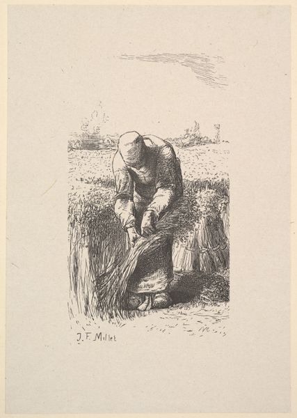 This etching, made by Bernardus Johannes Blommers, shows a man binding bean stalks in a vegetable garden. The figure, hunched over his task, represents the timeless connection between humans and the earth. The act of binding, central to the image, resonates deeply within our cultural memory. This motif echoes through various epochs. Think of the Fates in classical mythology, weaving the threads of destiny, or the medieval allegories of binding evil. Binding, therefore, represents a fundamental human activity of control, order, and constraint. Consider how the act of binding has appeared through history, evolving from ancient rituals to everyday tasks. Psychologically, it might be interpreted as an attempt to impose order on the chaos of existence, a primal urge to secure and protect. The hunched posture and the focused attention on the task evoke a sense of the intense connection between man and nature. The composition draws the viewer into a meditative state, reminding us of the cyclical nature of life and the enduring power of simple, repeated actions that bind our present to the past.