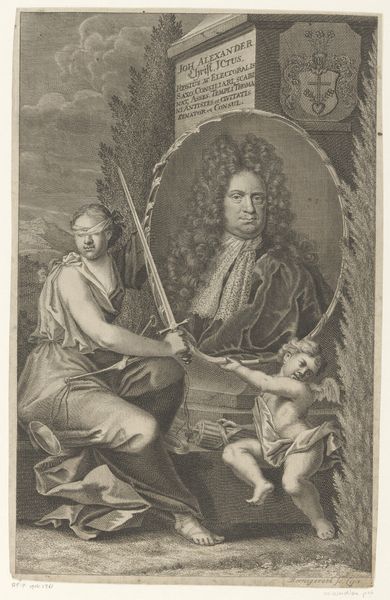 Curator: Here we have “Portretten van Anton van Dyck en Jacob de Bray,” created between 1708 and 1780 by Jacob Houbraken. It’s currently held in the Rijksmuseum’s collection. Editor: My initial impression is one of delicate monumentality. The subtle tonal gradations achieved through pen, ink and charcoal drawing on paper gives it this quiet authority. The use of line is masterful! Curator: Yes, and considering Houbraken's known work as an engraver, we see that skill informing this piece. Notice how the circular frames mimic the look of engraved portrait medallions. And observe how Anton van Dyck is positioned above Jacob de Bray, almost like a master and student. This hierarchical positioning of portraits was not unusual during the Renaissance, right? Editor: Absolutely, it visually represents influence and legacy, perhaps Houbraken is reminding us of the networks of artistic production, that nothing emerges from nothing, art-making builds on and even defers to its precursors, always. Do you see how the Cupid figure, not strictly related to the portraits, further elevates this piece into an allegory? It speaks to the enduring fame artists hope to achieve. The choice of pen and ink are interesting from a purely technical view— such permanence, like the fame these figures crave. Curator: It seems that Cupid acts as an immortal witness. He connects their earthly talent to some kind of higher inspiration. This element of timelessness really speaks to the human desire for remembrance. What do you make of the fruit arrangement in the lower portion? It feels very still life oriented amidst all the other elements. Editor: Well, the still life serves several functions I believe. Materially, fruit presents itself in a spectrum of colors, which shows the artist's capabilities. Symbolically, however, fruit conveys bounty and fertility. And decaying fruit is always a warning about mortality; and I would consider the materiality of paper, pen, and ink—as a tool to halt the effect of time. Curator: True. The drawing becomes a stand-in for life, holding onto the artists' visages long after they’re gone. And like them, its cultural significance can change shape. I see those tonal nuances suggesting a certain vulnerability as if even in portrayal, no one escapes the mark of time. Editor: This piece definitely reflects the Renaissance spirit, capturing both individual brilliance and collective aspiration, all through such economic choices of medium. Curator: Indeed, reflecting both the individual subject's talents and society's regard.