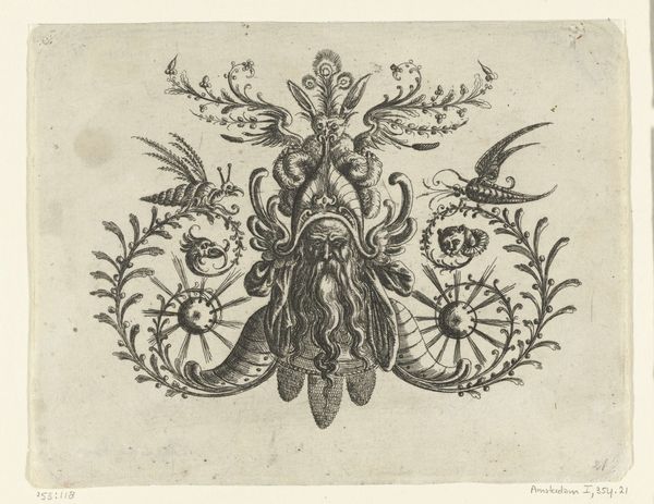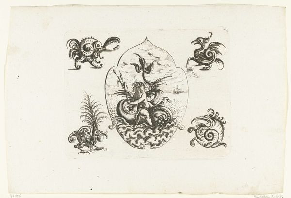 Editor: Right, next up we have "Sater met een mascaron als lichaam," or "Satyr with a Mask as a Body," made between 1573 and 1610 by Christoph Jamnitzer. It’s a drawing done with pen and ink, all these incredibly fine lines forming fantastic creatures. What do you see in this piece? It feels almost…dreamlike, but also very precise. Curator: Oh, absolutely! It’s like stepping into someone’s beautifully bizarre imagination, isn't it? What I find captivating is the way Jamnitzer merges the organic and the architectural, doesn't he? Look how the satyr's body transforms into this elaborate mascaron, a grotesque face often found in architecture. What do you think that says about the relationship between nature and artifice during the Renaissance? Editor: It makes me wonder if they saw them as more interconnected than we do now, almost as if one naturally evolves into the other. I'm curious about the placement of these beasts that border it as well. Do you think those have symbolism that is linked to the satyr? Curator: Hmm, great question! The positioning of the various fantastic creatures might indicate a very common fascination of the period: to create collections that were viewed encyclopedically. All these figures were of the real and the imaginary combined as the collection was symbolic for their owner, displaying his vast interest in everything. Editor: That's such a neat detail! To look at it from today's eyes, you can't tell if the owner's intentions for the symbolic purpose in this artwork, as an intended collection piece. Curator: Precisely! Which opens our minds to the many meanings artwork can contain! Each period and owner shifts those interpretations! It's quite the marvel if you ask me.