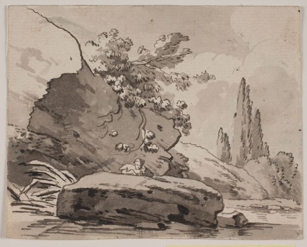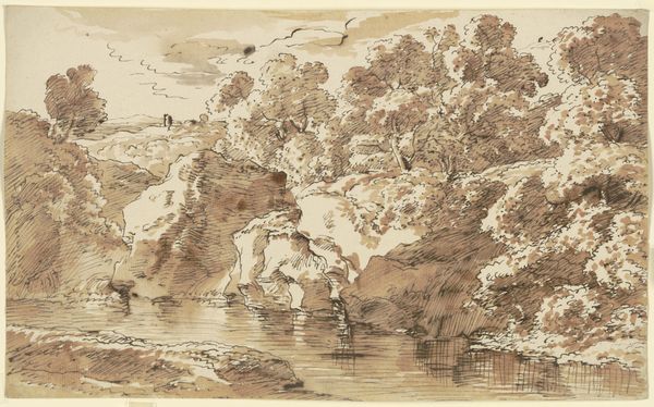 August Richter made this ink and wash drawing to explore the structures of the natural world. The composition divides into distinct zones: the rugged rock formations on the left, the tranquil river flowing across the middle, and the softer, tree-lined landscape on the right. Richter uses washes of grey and brown ink to build up layers of tone. The forms of the rocks are rendered with a combination of flowing lines and textured shading. The contrast between the solid, almost geometric forms of the rocks and the more fluid, organic shapes of the trees creates a visual dialogue. Space in the drawing is treated not as a void but as an active component, filled with atmosphere and light. Richter, through his formal choices, invites us to consider not just what the landscape looks like, but also how we perceive and interpret it through art.