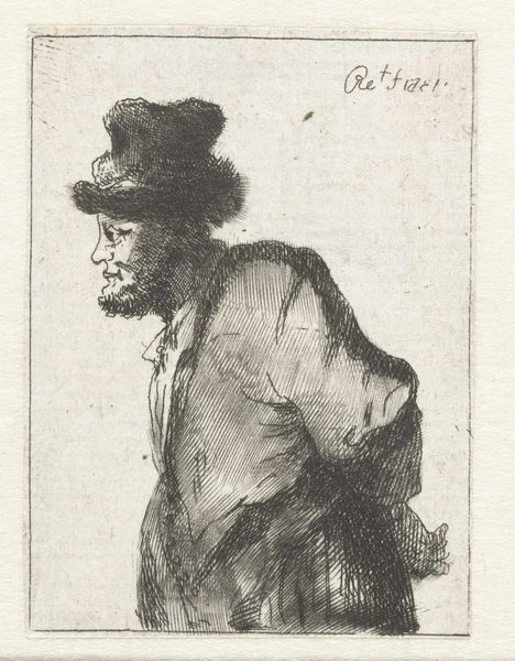 Editor: Here we have "Peasant with his hands behind his back," an etching by an anonymous artist, dating back to around 1631, housed in the Rijksmuseum. I am immediately struck by the diagonal lines creating the peasant's cloak. What is your take on this print? Curator: A compelling element lies in the linear quality of the etching. Notice the cross-hatching employed to define the form, building tone and texture. Consider how this technique directs our gaze, controlling our perception of light and shadow across the figure. Editor: It almost looks unfinished with all the sketch-like cross-hatching. How do we see that within the work? Curator: The network of lines doesn’t necessarily aim to deliver the most accurate realistic portrayal, but rather suggests form and volume. The dynamism of line, its varying thickness and density, becomes a primary subject of the work itself. What is your interpretation? Editor: So, the technique is almost as important as the subject matter. That shifts my perception. Curator: Precisely. The print challenges conventional portraiture. We move beyond likeness to engage with the pure artistry of the medium. Notice how the texture of the paper also interacts with the lines, almost blending together. Editor: Now I can appreciate the technique a bit more than the actual representation of the peasant. I had never really noticed that before. Curator: Indeed, such close scrutiny reveals new appreciation for even seemingly simple artworks.