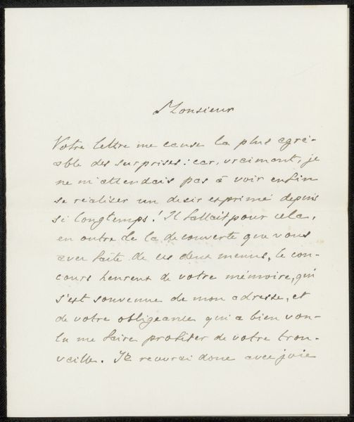 This is "Brief aan Ary Scheffer," a handwritten letter by Marie Étienne François Henri Baudrand. Written during a time when correspondence was a primary form of communication, this note offers a glimpse into the social circles and personal relationships of 18th-century France. The act of writing and receiving letters held significant cultural weight. Beyond the exchange of information, letters were a performance of social etiquette and an assertion of one's place within a network of contacts. Baudrand's invitation to Ary Scheffer reveals the importance of kinship and hospitality within the French bourgeoisie. The language used is polite and refined, reflecting the social conventions of the time. The letter also speaks volumes about gender roles and societal expectations. Baudrand mentions that his wife wishes to thank Scheffer for a gift, underscoring the role of women as custodians of domestic life and social graces. This small note offers a window into the intricacies of interpersonal relations and the subtle ways in which power and status were negotiated in the past.