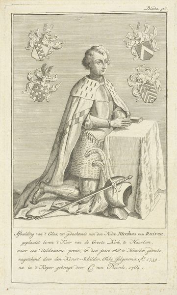 Editor: This is Reinier Vinkeles' "Portret van Claes van Ruyven," created in 1788. It's an engraving. The overall effect, at least at first glance, is incredibly formal and maybe even a little somber. What stands out to you as you look at this piece? Curator: The composition is deliberate. Observe the placement of Claes van Ruyven, kneeling but central, anchored by his attire and familial symbols, each element meticulously rendered. The coat of arms above—visual emblems carrying weight. How might they speak to lineage, identity, and aspiration? Editor: They definitely give off a powerful sense of history and tradition. So, do you think the symbols are the main focus here? Curator: They're integral, and beyond the crests, note his posture. Kneeling isn't just subservience; it’s also a gesture of piety, or reverence, depending on your reading. Now, couple this with the sword. Does it denote nobility, duty, or something else entirely? It could even symbolize both. How does the sword interact with the man? Editor: That's a good point. I guess it could represent a warrior kneeling in prayer, perhaps after battle? Curator: It's possible. Or think of it this way, the armor is rendered obsolete. The sword is down and to the side, representing a moment in between potential conflicts. Editor: That’s really interesting! I hadn't considered that. It's amazing how much symbolism can be packed into a single image. I appreciate the historical elements. Curator: Indeed. Images are never neutral. The careful deployment of symbols weaves a potent narrative. Visual languages that linger, prompting us to decipher, to remember.