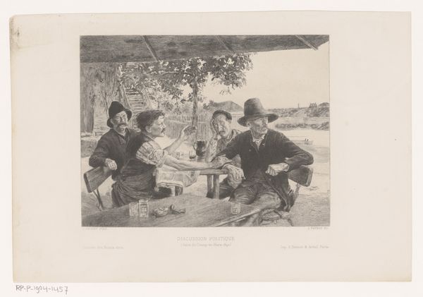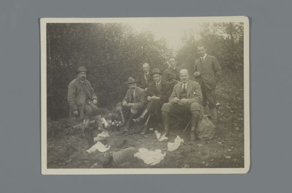 Curator: Ah, a glimpse into the past! This photograph, "Twee mannen en vrouwen aan een tafeltje op tennisclub," was captured by Gerardus Aalbersberg sometime between 1900 and 1906. It offers us a peep into a leisurely afternoon, I think. Editor: It feels...posed, but also intimate. Like we've stumbled upon a private gathering. There’s a certain stillness in the subjects that evokes contemplation. Curator: Indeed. Notice how the composition emphasizes a social hierarchy—men dominating the scene, women subtly positioned as adornments. And the bicycle parked just behind; a new technology and symbol of freedom. Editor: The bicycle intrigues me, definitely. A counterpoint to the static image of social gathering? It almost whispers of escape and breaking free. It has some of the iconography of an angel too. Look how it's positioned slightly behind one man's head. Curator: Fascinating interpretation. Do you see the image's inherent stillness also relating to mourning in that same way? As if posing still were some expression of grief? I think here it serves merely as a stylistic choice that gives us more than we'd imagine on first viewing. Editor: Precisely. Group portraits of the era were like secular icons of friendship, perhaps even little monuments of remembrance, if you allow. We all build memory palaces this way! And even if the placement is inadvertent, as you say, the mind instinctively seeks patterns, visual relationships. Curator: True. This simple moment at the tennis club becomes a visual riddle. Editor: These ordinary people become timeless through a lens—imbued with the power to evoke not only an era but something deep in our collective consciousness. Their shared experiences of leisure are immortalized, almost ritualized. Curator: I see the photograph, despite its humble subject matter, speaks volumes about identity, technology, and social roles. The image goes far beyond the two men and women portrayed. Editor: Leaving us with more questions than answers—and perhaps that's its greatest strength. I'd love a day spent in their silence. Wouldn't you?