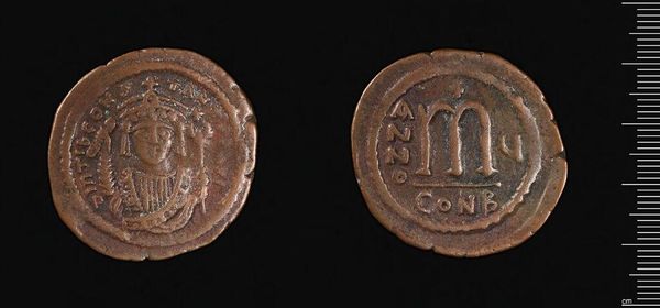 Editor: Here we see a coin of Justinian I. The raised relief and textures are still so clear. What do you see in this piece, looking closely at the form? Curator: The die-striking is quite masterful; notice the strong lines defining Justinian's figure, juxtaposed with the symbolic "M" on the reverse. How do these elements work together? Editor: The "M" is so bold; it almost overpowers the emperor's portrait. Is that a commentary on power, or simply a design choice? Curator: Consider the medium: a coin is inherently about value. The size and placement of the "M" perhaps emphasize economic strength as integral to Justinian’s reign. We might also consider the cross. Editor: That’s a new way for me to consider it. I appreciate noticing how the different elements of the design contribute to the meaning.