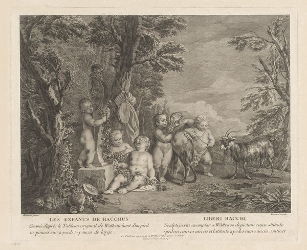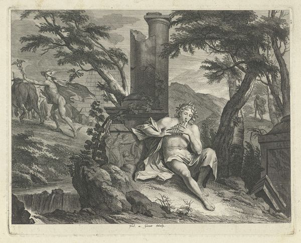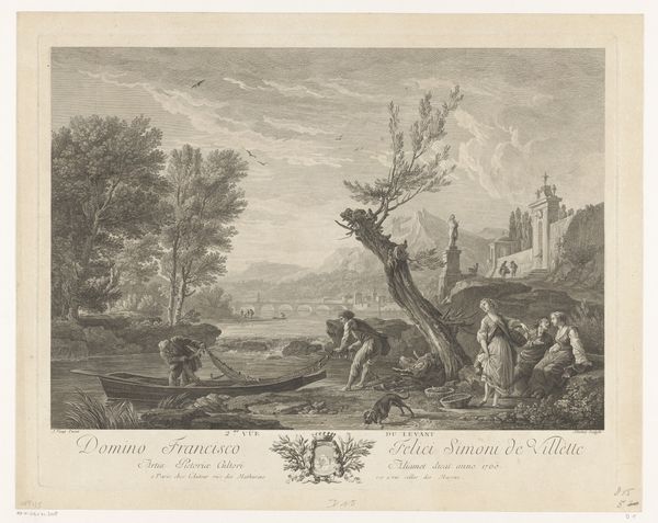 This etching, "Ubaldo en Danois op zoek naar Renaldo", by Nicolas Charles de Silvestre presents a landscape meticulously rendered in monochromatic lines and gradations. The composition, with its detailed foreground figures and a distant palatial structure, invites the eye to traverse through layers of space. Silvestre employs line and form to differentiate realms of action and repose. Notice how the figures on the left are integrated into nature, characterized by curvilinear lines suggesting a life of ease and pleasure. This contrasts with the angular tension of the two armed men on the right, who are confronted by a beast-like creature. This juxtaposition establishes a semiotic field where ideas of duty and desire collide. The landscape itself serves as a stage, where the interplay of light and shadow sculpts the figures and architecture, creating a dynamic contrast. The strategic use of perspective draws us into a narrative that seems to question the boundaries between heroic action and seductive allure. Ultimately, the beauty of this artwork lies not only in its aesthetic qualities but also in how it encourages us to decode its symbolic language and engage in a dialogue with the past.