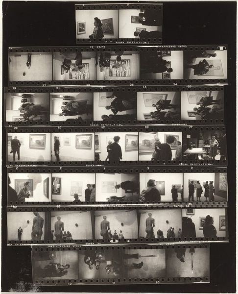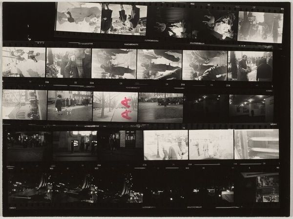 Curator: This is "Various family S7", a gelatin-silver print by Robert Frank, created around the early 1950s. Editor: Wow, what a mood! It feels like looking at lost memories or a forgotten dream. It's all fragments, like glimpses through a snow globe. Curator: Indeed, it encapsulates a poignant sense of displacement and perhaps alienation. The fragmented nature of the film strip, juxtaposing scenes of ordinary life – families, streets, snow-covered landscapes – creates a powerful visual commentary on the transient nature of modern existence. We might consider Frank's own experience as an immigrant navigating post-war America. Editor: Absolutely, and the darkness, the stark contrast. There is that single frame on the top that’s so bright; I wonder if it is intentional—like a flicker of hope or just the ghost of the dark images refusing to go away. What is he saying, here, in this juxtaposition of frames? Curator: He is perhaps asking us to consider the constructed nature of the photographic image, the choices made in framing and sequencing. How are these visual decisions contributing to a specific narrative, or perhaps disrupting it, presenting instead an ambiguous tapestry of human experience? We might reflect upon how issues of identity, belonging, and social observation intersect in this fragmented composition. Editor: Right, you’re right; there's a narrative here for sure. It's almost like sifting through someone else’s consciousness, trying to piece together the untold stories behind these faces and urban scenes. Like finding these in a drawer after someone’s been gone. A poignant, melancholic poem. Curator: Yes, Frank challenges the conventional documentary approach by layering aesthetic experimentation with raw social commentary. Editor: It is also visually beautiful; to create art out of the act of collecting these fragments; that is, itself, its own commentary on family and connection. You never have the whole picture. And maybe the connections are all we have. Curator: Ultimately, Frank invites us to reflect on the human condition through a lens that is both deeply personal and universally resonant. Editor: Beautiful; the fragments become a window. I see now the darkness. And in it, so much beauty and loss.