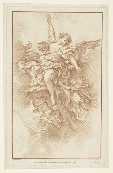 Curator: This is Antoine Coypel's "Study for the Figure of Minerva." Note the dimensions, roughly 51 by 32 centimeters. Editor: She's caught mid-motion, isn't she? Like a half-remembered dream. The figure seems to float right off the paper. Curator: Indeed. Observe Coypel's delicate use of red and black chalk. The lines are tentative, searching, revealing the artistic process. Editor: There’s an energy here, almost unfinished, which I find so compelling. It feels more alive than a perfectly polished work. A goddess in progress! Curator: The hatching and cross-hatching create subtle tonal variations, defining form and volume. Consider, too, the blank spaces—their strategic importance. Editor: It invites you into his process, that's for sure. I can almost feel him wrestling with the pose, the light, the expression. Curator: Precisely. We witness Coypel's intellectual and aesthetic labor in real-time. Editor: It’s a beautiful testament to the journey, not just the destination. I feel quite honored to have been given this glimpse.
