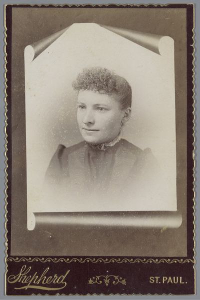 This is a photographic portrait of an unknown young woman by Adolphe Zimmermans. The print is small, and the sepia tones lend it a warm, aged quality. The composition is simple. The woman's face is softly lit, capturing a sense of serene composure. Zimmermans employs tonal variations to delineate form, focusing on the texture of her hair and the delicate fabric of her attire. The photograph's structure reflects broader cultural codes of portraiture. The formal pose and muted tones evoke a sense of decorum and restraint. However, the subject’s gaze, directed slightly off-center, hints at an interiority that transcends mere representation. The print's materiality—its size, tone, and texture—contributes to its meaning. It functions not only as a record but also as a poignant artifact, inviting contemplation on memory, representation, and the passage of time.