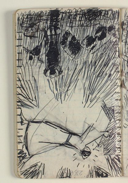 Niels Larsen Stevns made this sketch, "Engle vælter stenen fra graven" or "Angel Rolling Away the Stone from the Tomb" using ink on paper. The stark contrast between the dark ink and the light paper immediately grabs your attention. The composition is a flurry of vertical and diagonal lines, creating a sense of chaotic movement. This visual turmoil stirs feelings of unease, maybe mirroring the biblical scene's dramatic intensity. The rawness of the sketch, with its visible strokes and unfinished areas, brings forth an interesting intersection of form and content. The angel, rendered with swift, angular lines, is not a figure of serenity but one of dynamic action. The hatching technique in the background suggests a space filled with either light or some ethereal presence. Ultimately, this sketch functions as more than just a depiction; it's an exploration of how line and form can convey spiritual and emotional depth. The lack of resolution leaves space for the viewer to engage, inviting personal interpretation of faith, power, and the unknown.
