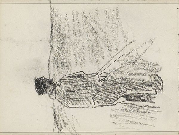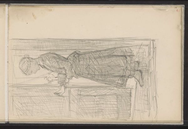 Anton Mauve created this drawing titled 'Boer op klompen bij een venster' using graphite on paper. It presents us with a study of a man, likely a farmer, rendered with a striking emphasis on form through the starkness of line and contrast. The composition is dominated by the figure's horizontal pose, its weight emphasized by dense, rhythmic strokes that define the contours of the body. The network of lines mimics the texture of fabric and the solid form of a man lying down. Mauve masterfully uses the economy of line to evoke a sense of weight and groundedness. The drawing plays with ideas of representation and abstraction. The figure is not defined by explicit detail but rather by the essence of form, challenging the viewer to consider how much information is necessary to convey a sense of presence. This reflects a broader artistic interest in the power of suggestion, inviting us to complete the image in our minds. The very act of drawing itself becomes a subject.