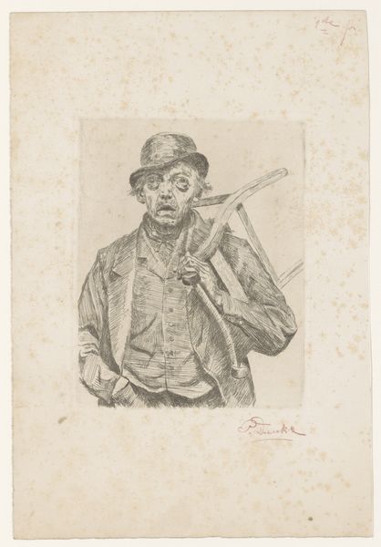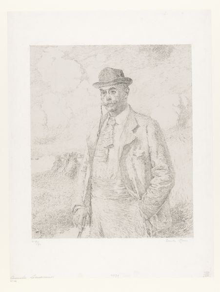 This etching by Frans Lauwers, made around the turn of the century, presents a hunting scene. It's important to remember that prints like this one were not simply reproductions, but original works of art in their own right. The process begins with a metal plate, likely copper or zinc, which is then coated with a waxy ground. The artist scratches an image into this ground with a sharp needle, exposing the metal. The plate is then submerged in acid, which bites into the exposed lines. The longer the plate remains in the acid, the deeper the lines become, allowing for a richer, darker impression when printed. Look closely, and you can see how Lauwers used this technique to great effect, creating a range of tones and textures. The crisp lines of the hunter’s jacket contrast with the softer, more blurred lines of the landscape. This speaks to the labor involved not only in the hunt itself, but also in the skilled work required to produce such a detailed and evocative image. Printmaking traditions are important to consider as they can often be overlooked in favor of painting or sculpture. This work reminds us of the value in looking closely at materials and processes to fully appreciate the artistry involved.