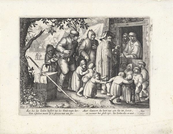 Curator: This engraving, "Kneeling Man before a Woman near a Garden Bench" by Philippus Velijn, dated 1811, presents a narrative scene in an elaborate outdoor setting. Editor: It's amazing the level of detail Velijn achieved with just engraving! It has an old-fashioned charm with the ruffs and setting, yet I also find it theatrical, almost staged. What compositional elements strike you most forcefully in this work? Curator: Observe how the figures are meticulously arranged. The kneeling man occupies the lower-left, creating a distinct focal point, whilst the woman forms the immediate, and balanced, counterpoint. We might observe too, that the landscape, or "garden", in the artwork’s title, becomes essentially a structured backdrop, its purpose seemingly to highlight this interplay of figures, costumery, and theatrical arrangement. What do you think that arrangement conveys, in relation to our figures? Editor: I hadn’t thought of it as ‘theatrical’ staging, but seeing it now it brings the romantic aspect out further! How would you analyze the use of light and shadow, within the artwork's formal structure? Curator: Light and shadow contribute significantly to the definition of forms and the overall mood. Notice how the delicate gradations create depth and volume, particularly in the drapery and foliage, as well as to draw the viewer's gaze from left to right, top to bottom. A more dynamic contrast of these two artistic elements may arguably produce an entirely different emotional reaction. It serves as a demonstration of how simple elements can profoundly influence the overall aesthetic and thematic dimensions. Don't you agree? Editor: I completely agree! It is almost like Velijn carefully modulated light in distinct spaces to convey differing levels of emotion to these different groups, or 'characters'. Thanks, that perspective really clarified how to view the print. Curator: Indeed. It has been enlightening to revisit the fundamentals, noting just how Velijn’s composition prompts contemplation of Romantic form itself.