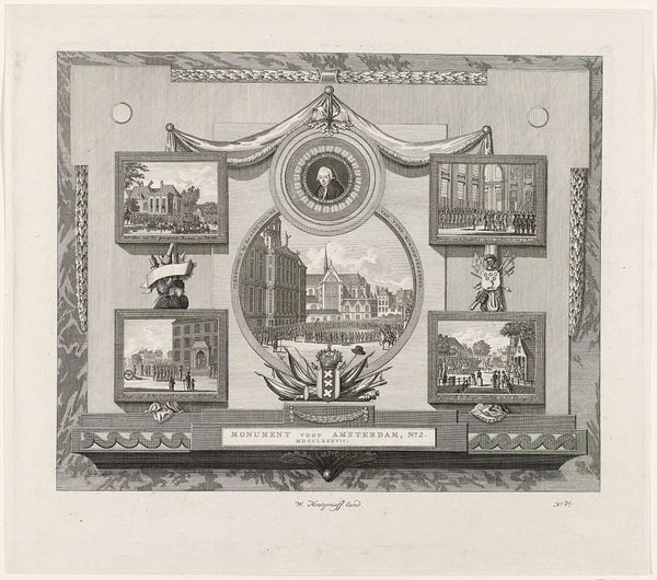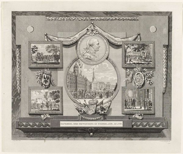 Curator: Looking at this engraving, "Zes medailles met voorstellingen uit de Franse geschiedenis"—"Six Medals with Scenes from French History"—crafted between 1702 and 1767, primarily with engravings, what jumps out at you? Editor: Oh, my goodness, it's like peering into a tiny, bustling world! It feels theatrical, with all the distinct vignettes laid out almost like a storyboard for a grand historical drama. Curator: That’s a great observation. The artist, Jacob Folkema, truly presents these historical moments with an almost narrative intensity. For me, I keep thinking about the engraver’s hand—the precision, the sheer labor of detailing these minuscule scenes. Imagine the workshop, the tools, the almost monastic focus required. Editor: Absolutely, I see a fascinating interplay between craft and what you could even call propaganda. These medallions weren’t just decorative; they were meant to shape perceptions, perhaps solidify certain political narratives through mass production of printed imagery. I wonder about their role in disseminating royal or aristocratic ideas… Curator: Precisely! Engravings like these were incredibly effective for circulating narratives. It's almost like the social media of the time—distributing ideas and stories visually, in a reproducible format. Editor: And that medium dictates so much of the message. An engraving isn't a painting, right? It isn’t a unique, bespoke object made of oils and pigment but a multiplication of image through labor, etched line by etched line. The starkness of black and white lends a certain gravity, maybe even a sense of “officialdom” to these scenes, regardless of their factual basis. Curator: And the material aspect—paper, ink, the press—they're not just neutral conveyors. They subtly inform how people understand history. Consider how that changes who can access the representation. This medium lowers the threshold for viewership dramatically, disseminating information into the culture more democratically…sort of. Editor: Yes, there’s something to be said about the distribution mechanism itself. Think about how the meaning shifts when a historical scene goes from, say, a painted portrait accessible to an elite few, to an engraving that can be disseminated to the masses—each impression a physical record of production and ideological intention. Curator: So much about this points to that very act of production, that it becomes hard not to think about where the art begins. Editor: Definitely, and reflecting on this piece, it's a good reminder that artworks don’t just reflect history; they’re actively *making* it in tangible, material ways.