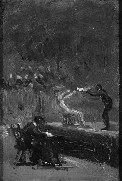 Editor: This small oil painting, "Two Peasants Fighting with Knives" by Adriaen van Ostade from 1640, really grabs you with its chaotic energy, even though it's not large in scale. What jumps out at you about this scene? Curator: I see a fascinating snapshot of 17th-century social dynamics. Ostade often depicted peasant life, but not always idyllically. How does this deviate from typical heroic historical narratives of the time, do you think? Editor: Well, most history paintings at the time focused on powerful leaders and grand battles, whereas this hones in on the gritty realities of everyday conflict, away from any heroism. What does that imply about its reception? Curator: Precisely. This challenges established hierarchies and exposes the darker aspects of society often overlooked by the elite. Look at the setting – a dimly lit, crowded interior. How does this influence the viewers’ understanding of these people? Editor: It creates a feeling of claustrophobia and underscores their lower social standing; the opposite of royal finery. Also, the dark and muddied tones of the paint definitely emphasize that grime. Curator: The artist is using a type of visual vernacular, yes. This painting functions as a genre painting with a historical function by subtly subverting expectations, forcing us to reconsider who is deemed worthy of portrayal. What lasting impression does it leave? Editor: It makes me wonder about the purpose of art: documenting what’s idealized or holding a mirror to society. Thank you for pointing that out! Curator: It's interesting to consider its function. Indeed, looking beyond the surface tells us much about art’s powerful cultural role in reflecting– and sometimes reforming–society.
