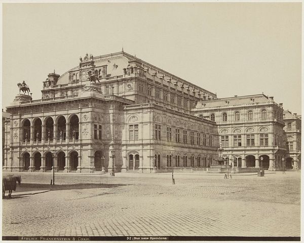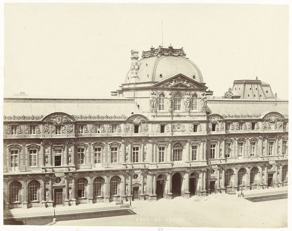 Editor: This photograph, simply titled *Gezicht op het Musée du Louvre in Parijs*, or View of the Louvre Museum in Paris, was taken sometime between 1887 and 1900. It has such a stately, almost theatrical feel, don't you think? What underlying themes might it evoke for the viewer? Curator: Indeed. Think about the cultural weight of the Louvre itself, already a historic palace transformed into a museum by this time. Its imposing façade, captured in this photographic print, acts as a powerful symbol of accumulated knowledge and artistic achievement, yes? The formal balance suggests stability and order, ideals deeply rooted in French cultural identity. Editor: So, even without any people prominently featured, the building speaks volumes? Curator: Absolutely. Consider how photography, a relatively new medium at the time, aimed to document reality objectively. But even here, the artist frames reality in a specific way. How might the soft, sepia tones enhance the nostalgic feeling, reminding us of cultural memory? Is it to monumentalize or make intimate this imposing cultural force, perhaps? Editor: That’s a really insightful question. It makes me consider how the choice of capturing this vast architectural space is itself a form of storytelling. It almost hints at France's desire to visually display its prominent global position in art and culture. Curator: Exactly. Now, note how the classical architectural style embodies reason, and proportion... However, can you feel that slight detachment, almost a yearning for a past order that's increasingly mediated by modernity through photography itself? The horse and carriage might hint to something similar… Editor: I do! Seeing it this way makes the photograph less like a mere depiction and more like a reflective commentary on France's identity. It definitely leaves me with more questions than answers. Curator: It's in the questions we unlock the lasting visual power that artwork can unlock.