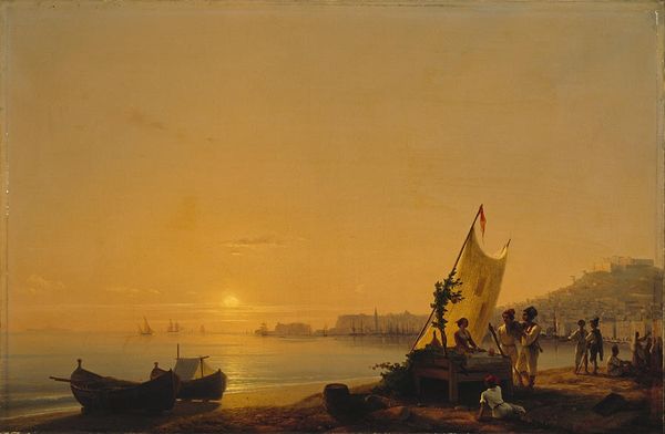 Editor: This is Ivan Aivazovsky’s "Golden Horn," painted in 1872. It looks like an oil painting. The scene feels almost dreamlike with the moon's glow reflecting on the water. What do you see in this piece? Curator: Initially, observe the artist's skillful manipulation of light. Note the atmospheric perspective, the haziness that softens the forms of the distant city. The gradations in tone create depth, drawing the eye from the detailed foreground towards the ethereal background. Is there a structural emphasis apparent in this composition? Editor: I think so, the composition has distinct layers, from the boats in the foreground, the land mass in the middle, to the hazy city skyline in the back. It leads the eye, definitely. Curator: Precisely. The darker masses in the foreground act as anchors, grounding the visual experience, while the light reflected on the water creates movement, activating the surface. Furthermore, consider the function of the vertical elements, such as the masts and minarets. Editor: They draw the eye upward, sort of echoing the shapes of the palm trees. There’s a real contrast between the sharp vertical lines and the more hazy background, which adds depth to the image. Curator: Exactly. These linear forms punctuate the composition, establishing a visual rhythm that counterpoints the fluidity of the water and the atmospheric sky. Aivazovsky constructs a compelling interplay between contrasting formal elements. What do you make of the artist's choice of palette? Editor: I’d say he used a pretty restrained palette, focusing on a limited range of browns, blues, and golds to evoke the mood. It unifies the entire scene. Curator: Indeed. This restrained use of color creates a harmonious visual field. The chromatic unity underscores the painting's cohesive structure. It has been enlightening to analyze its structural components. Editor: Yes, I have a better understanding now of how the visual components create the image.