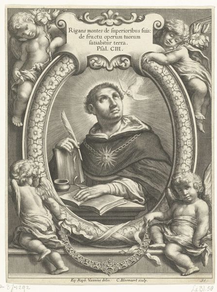 Curator: This is a print depicting H. Norbertus, created sometime between 1651 and 1711 by an anonymous artist. The technique appears to be engraving, or possibly a combination of engraving and etching. It’s quite detailed, wouldn't you agree? Editor: Immediately I'm struck by the airiness, the lightness of it all. It feels as though it's floating, ethereal even, thanks to all those cherubic figures scattered around the central figure. The swirling clouds really add to the sense of elevation. Curator: Yes, the cherubs are prevalent symbols in Baroque art, signifying divine presence and innocence. They create this ornate frame around Norbertus, but what do they represent in this specific context? I think their presence underscores Norbertus’s perceived holiness and his connection to the divine. Each carries some object – foliage, laurel, alluding to life, sacrifice and rebirth, perhaps. Editor: Exactly. Look how deliberately Norbertus is placed front and center. He’s framed not only by cherubs but also his own symbols of authority— the cross and the reliquary. What power dynamics are in play here with the way he commands the gaze? It also tells a story of the church itself, maybe reaffirming the faith during times of turmoil and religious disputes. Curator: Undoubtedly, you are right. His central placement is quite intentional. Consider the reliquary, a vessel holding sacred relics – an emblem of faith and divine grace. Then there’s the processional cross he carries, marking his spiritual leadership, it grounds him. The artist strategically employs symbols that underscore Norbertus's role as a religious figure. Editor: Absolutely, the cross anchors him, linking the divine and the earthly. He’s very austere. Considering that printmaking democratized art production and consumption during this time, wouldn't images like these become important tools for shaping public perception and propagating certain ideologies, religious in particular? Curator: A crucial point to remember! Printed images circulated widely, acting as powerful tools in spreading ideas. Here the composition works with its historical moment to remind its audience that even a simple engraved artwork could hold layers of cultural memory and carry so much political power. It's much more than just a holy figure. Editor: Indeed! These early prints, with their layered symbolism and their role in cultural messaging, gives us a wonderful insight into art history, social history, and art's own means for social commentary.
