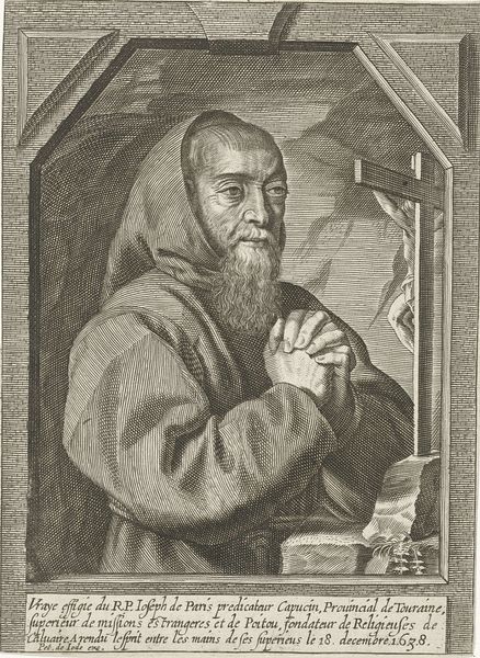 Editor: This is Claude Mellan's "Father Joseph," made sometime around the mid-17th century. The intricate hatching is quite striking. How might the materials used and the printmaking process itself influence our understanding of the artwork? Curator: The meticulous labor involved in creating this engraving speaks volumes. Consider the copper plate: its cost, the engraver's skill, and the time invested. The print becomes a commodity, reproducing religious imagery for wider consumption. Editor: So, the print functions as both art and a devotional object, shaped by its material production? Curator: Precisely! The very act of reproducing Father Joseph’s image transforms him into a symbol, mediated by the material processes of its creation and circulation. What does that suggest about the role of religious figures in society at that time? Editor: I see your point. The material reality of the print allows the image to reach a wider audience, influencing how people engage with religion and perceive important figures. Thanks for the insight! Curator: An interesting dialogue. Thinking about art through its means of production really shifts our perspective.