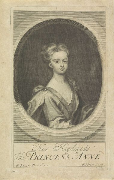 Curator: This engraving from between 1790 and 1819, housed here at the Rijksmuseum, is a portrait of Isabelle van Sayn-Hachenburg-Kirchberg by Benjamin Samuel Bolomey. Editor: The first thing that strikes me is the delicacy of the lines. Despite the formal pose, there's an incredible softness to her features and hair. Curator: Indeed. And it is important to remember that during this period portraits served as significant visual signifiers of status, power and lineage, especially for women in positions of nobility like Isabelle. How might the composition reinforce these ideas? Editor: Well, consider the oval frame, a traditional format that invokes classical medallions. It subtly alludes to ancient ideals of beauty and virtue and aligns her image with established iconography of power, and by extension gendered power. However, doesn’t the very act of confining her likeness in this manner reflect constraints placed on women of her rank? Curator: That's a keen observation. It highlights the tensions inherent in portraiture of the time; the representation of individual identity coexisting with societal expectations and gender roles. Her dress and hair are, while fashionable, less overtly opulent than some portraits of the era. Does this choice signal anything about her personal or political positioning? Editor: Perhaps a conscious attempt to project an image of understated authority. During a period of revolution and societal upheaval across Europe, conspicuous consumption would be tone-deaf. Subtlety here serves a purpose: it presents Isabelle as responsible, attuned, and perhaps even empathetic. We see this play out similarly even in modern contexts and images, how much, after all, has changed? Curator: And the text below, which identifies her as a “Regeerende Prinses,” governing princess further reinforces the portrait’s intent of asserting her political legitimacy and historical weight in a turbulent period, making a point about what it meant to have female leadership. Editor: Seeing this engraving invites reflections on women in positions of authority, the power dynamics that influence representation, and the fascinating ways those in the past sought to shape perceptions. Curator: It certainly encourages us to critically examine not only the artistry but also the complex historical, social, and gendered narratives embedded in images like this.