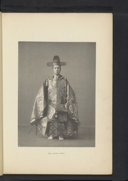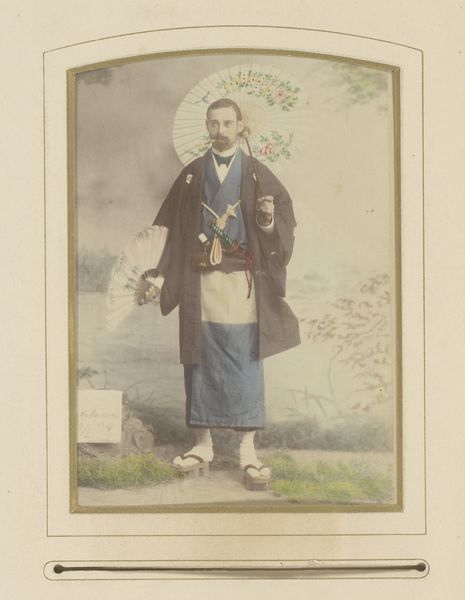 Editor: Here we have *Japanese High Priest in Full Canonicals*, a hand-colored daguerreotype created in 1869 by Felice Beato, now residing at the Metropolitan Museum of Art. The formality of the portrait, along with the striking detail in the robes, gives the image a sense of both authority and mystique. What visual elements stand out to you? Curator: Initially, the contrasting textures arrest the eye. The smooth skin of the subject plays against the elaborate embroidery of the outer robe. And consider the linear effect achieved by the arrangement of the folds in the cloth. How would you describe the photographer’s handling of light and shadow? Editor: There’s a very subtle gradation, almost a diffused quality to the light, which softens the subject’s features while enhancing the textile patterns. It makes it difficult to know exactly what materials we’re viewing. How does that indistinct materiality affect the viewer's interpretation, in your opinion? Curator: The ambiguity, I believe, heightens the sense of ritual. The material recedes in its tangible reality to instead symbolize status and role, prompting viewers to ask whether that role is itself defined or obscure. Is this how one encounters faith? Editor: That’s an interesting observation about faith. Curator: One is tempted to see how meaning becomes less about the 'what' of the figure and more about the structural, aesthetic effect it carries. A matter of seeing a figure reduced to formal play—the intersection of line, shape, and colour. Do you perceive any symbolic purpose in the composition? Editor: Not immediately. It prompts more questions than it answers for me. Curator: Indeed. In the end, such a visual deconstruction prompts continued conversation, rather than settles into simple knowing.