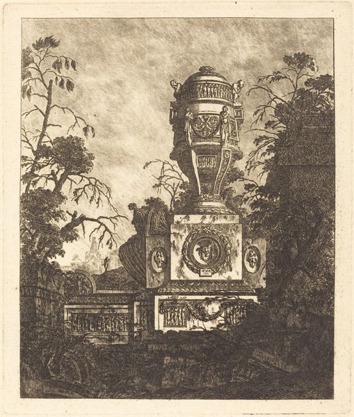 Jean Laurent Legeay rendered this intriguing vase with intertwined serpents in etching technique. The serpent motif, so prominent here, winds its way through the history of human imagination, laden with diverse meanings. Consider the serpent in ancient Greek mythology, often linked to healing and the god Asclepius, yet also embodying danger. Here, these serpents support the vase, a symbol of containment and potential. This dual aspect echoes through time, reemerging, for instance, in the caduceus, where serpents entwine a staff. One cannot ignore the serpent's association with primal instincts. Its sinuous form and shedding of skin taps into subconscious fears, desires, and the promise of rebirth. The presence of these symbols generates a powerful tension. These images trigger something deep within us. We find ourselves drawn into a timeless narrative, recognizing how these symbols persist, transformed yet familiar, in the vast theater of cultural memory.