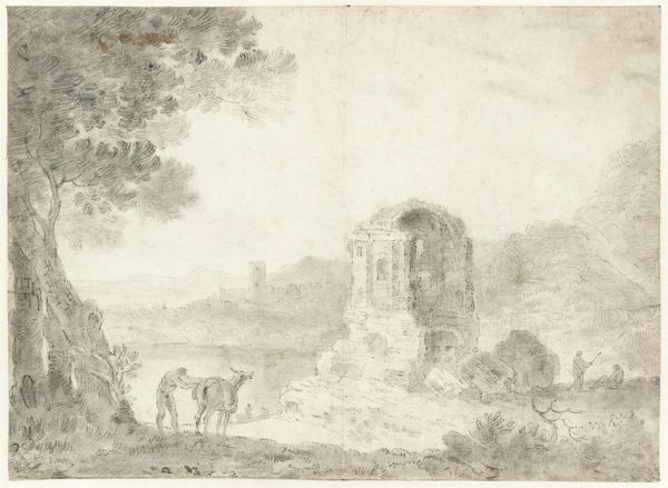 Editor: So this is Bartholomeus Breenbergh’s "Ruins of the Baths of Caracalla," created between 1638 and 1642, rendered with ink, pen, and etching. I am really struck by the interplay between nature and the crumbling architecture. It's like a stage for the passage of time. What story do you see unfolding in this piece? Curator: I see the deliberate construction of a historical narrative. Breenbergh isn't merely depicting ruins; he's engaging in a dialogue about Rome’s past and present. How are the figures placed in relation to the ruins? Notice that they appear diminutive and almost inconsequential when confronted with these remnants of grandiosity. It reflects the fleeting nature of human power against the enduring presence of history. Editor: That's a great point. The figures almost seem to wander aimlessly through the landscape, oblivious to the grandeur that once existed. It also makes me consider how our perception of history shifts over time. Were these ruins romanticized, do you think? Curator: Absolutely! This wasn't merely documentation; it was an interpretation that catered to the sensibilities of his time. The Romanesque style hints at this romantic vision. Consider, who were Breenbergh’s patrons, and what was their relationship with the depiction of Roman history? Editor: It's interesting to consider how art, even seemingly objective landscapes, reflects a certain political viewpoint. It isn't just about depicting something that's there, but about making a statement about its context and relevance. Curator: Precisely. By highlighting the "history painting" aspects, Breenbergh offers us an insight into how the 17th-century Dutch artists negotiated their own cultural identity in relation to classical antiquity. These ruins are not silent relics, but stages for understanding political views. What did you find most revealing about our conversation? Editor: It shifted my perspective. What I initially saw as an image of the passage of time became a mirror reflecting societal views on history and power. Thank you! Curator: Likewise. Seeing how you connected the image and political context encourages deeper analysis.