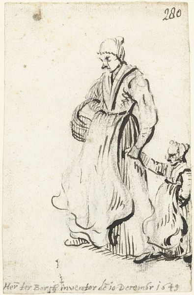 Editor: This is "Staand stel in kostuum, met elkaar in gesprek," or "Standing Couple in Costume, Conversing," a drawing in pen and ink by Harmen ter Borch, around 1654. They’re both dressed so ornately. What’s your take on this little drama? Curator: I see this less as a finished piece and more as a visual record of social dynamics in the Dutch Golden Age. These sketches offer insight into the gendered expectations of the era. What do you notice about their posture, their dress, and their apparent conversation? Editor: Well, she’s holding a staff, standing very straight, while he… is he bowing? His outfit looks much more theatrical. Curator: Exactly. Think about performance of identity here. The male figure, in his flamboyant costume, seems almost subservient to the woman. Could Ter Borch be commenting on the changing roles of men and women in a rapidly evolving society, perhaps questioning traditional patriarchal structures? Editor: So it's not just a genre scene, but a potential commentary on power? Curator: Precisely. Consider the context: the Dutch Republic was a commercial powerhouse, and women, particularly those from merchant families, wielded significant influence. Perhaps this drawing captures a moment of subtle negotiation in gender roles. How does thinking about this socio-political backdrop affect your reading of the artwork? Editor: It makes it much more complex! I saw just a fancy drawing, but now I see a power dynamic. Thanks for expanding my perspective! Curator: And thank you for posing such insightful questions. By linking art to broader social concerns, we can truly excavate the richness of these historical sketches.