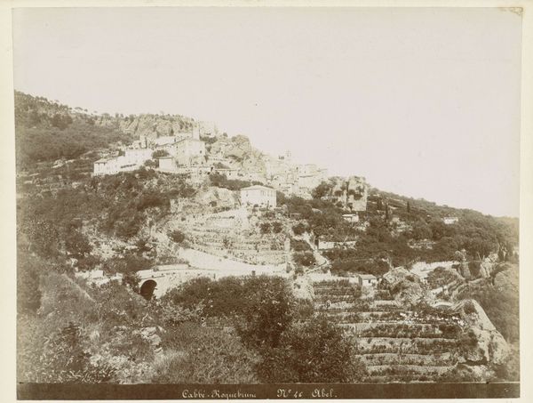 Editor: We're looking at "View of the Parvati temple complex in Pune, Maharashtra, India," a photograph by Samuel Bourne, taken between 1865 and 1872, using the albumen print process. I’m struck by how the architectural forms contrast with the wild, overgrown landscape. What compositional elements stand out to you? Curator: The image’s success lies precisely in that interplay of organic and geometric forms. Consider how Bourne uses the rising diagonal of the hillside. It leads our eye upward towards the complex structure of the temple and other buildings. Notice how the tonal range, from the darker foreground foliage to the light, hazy distance, creates depth and perspective. Editor: So the photograph isn't just capturing the temple, but also the way light and shadow play across the terrain. Curator: Exactly. Bourne masterfully manipulates the qualities inherent in the albumen print medium. Observe the detail rendered in the vegetation compared to the almost ethereal rendering of the distant landscape. How do these choices impact your reading of the photograph? Editor: It gives the temple a kind of…authority. It feels solid and present while the background kind of fades into abstraction. So, Bourne's choice of printing method enhances the clarity of form? Curator: Indeed. The choice to emphasize specific visual elements directs our gaze. This albumen print, rather than serving merely as documentation, operates on a plane of formal concerns. The print reveals, perhaps even imposes, an aesthetic order. Editor: I see, I was so focused on the subject that I had missed some of the key pictorial devices. Thank you, that was so helpful. Curator: My pleasure. Focusing on these fundamental visual elements unveils so much in art.