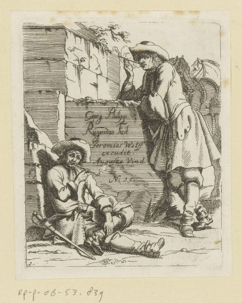 Curator: Here we have "Drie personen luisteren naar man met brief," or "Three People Listening to a Man with a Letter," an etching dating from between 1750 and 1811, credited to Carl Friedrich Holtzmann. What catches your eye? Editor: The light! It’s stark, almost theatrical. It throws those figures into such high relief, lending an air of dramatic pronouncement to what is probably a very ordinary scene. There's a quality of both seriousness and expectation hanging in the air. Curator: It’s the classic narrative tableau. Consider the symbol of the letter. It represents communication, yes, but also power dynamics. The man reading possesses knowledge the others don’t, instantly creating a social hierarchy. We see that rendered visually. The cultural memory of the town crier is embedded there. Editor: Precisely, and Holtzmann very cleverly stages it in a very familiar public space - probably near an entrance where there are stacked wood scraps. It transforms an ostensibly private matter, this reading, into something very public, almost an event. I am intrigued by the interplay of formality and everyday life. What could the social role be of such "performance" in the baroque era? Curator: That public dimension shapes our interpretation. We understand, even subconsciously, the societal impact of literacy and information control during the late Baroque and early Romantic periods. It resonates with anxieties and aspirations circulating through rapidly modernizing communities. Editor: Note also that the subjects almost lean into one another. What emotions were baroque audiences expected to associate with scenes of common life? And were the poor common folk depicted? This etching provides important insights into who held cultural capital during Holtzmann's time. Curator: An interesting lens, that consideration of class representation. It's also valuable to recall that, being an etching, this work would have been widely reproducible. Think of its potential as visual rhetoric and propaganda. Editor: Right! Which opens a wide array of questions about the political uses of these kind of images... A rather unassuming piece, sparking huge cultural insight. Thank you. Curator: Yes. And in this simple scene, we glimpse not just a story but also a snapshot of society in transformation. An evocative little tableau.