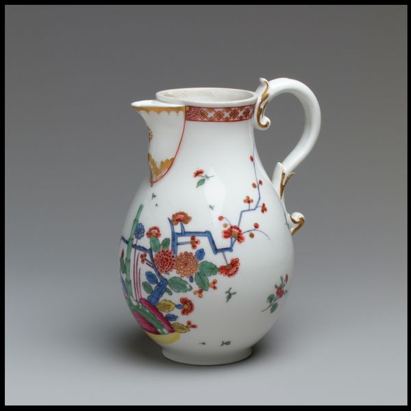 Curator: This is a Worcester Royal Porcelain Company coffee pot, crafted around 1775. The form and decoration speaks volumes about the era. Editor: My immediate impression is the explosion of ornamentation against a very controlled shape. The visual energy is really striking. Curator: Indeed, the use of these bright colors and floral patterns weren't merely decorative choices; they carried profound cultural significance at the time, referencing trade with the East and an aristocratic taste for exotic botanicals. These motifs represented prosperity and sophistication. Editor: Looking closer, you can see how the curvilinear form is echoed in the floral arrangements and how they complement the rococo love of asymmetry, offering an undulating rhythm across the pot’s surface. The composition is complex but not chaotic. Curator: Precisely. Even the smallest flower serves as a signifier of abundance and beauty, echoing sentiments from both European and some Eastern philosophies. Think of the flower as a symbol of ephemeral beauty but also resilience—concepts very important in that period of growing empires. Editor: The ribbed porcelain construction offers not just visual texture, but a tactile dimensionality. It’s more than mere decoration, each groove has a subtle rhythm, it invites one to experience its full curvature, especially along the piece's ovoid form. Curator: Beyond surface-level decoration, it suggests stories, family traditions and perhaps also political allegiances – a complex tapestry of lived experiences. The coffee pot then acts almost like a family crest, showcasing affiliations and aspirations of the household. Editor: Yes, the materiality supports this reading; porcelain itself was prized for its translucence and delicateness but its strength suggested the status and permanence they desired. There’s such careful negotiation between functionality and high aesthetics here. Curator: Ultimately, what we're beholding is a convergence of artistic craftsmanship, symbolism and cultural values encoded in an everyday object, elevating it far beyond its basic utility. Editor: Right. What looked at first like a simple floral design is a deep expression of cultural pride and sophistication. I see how powerful it could have been.