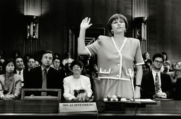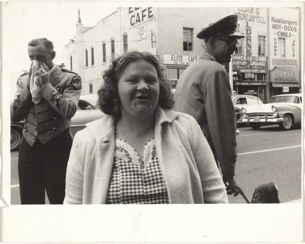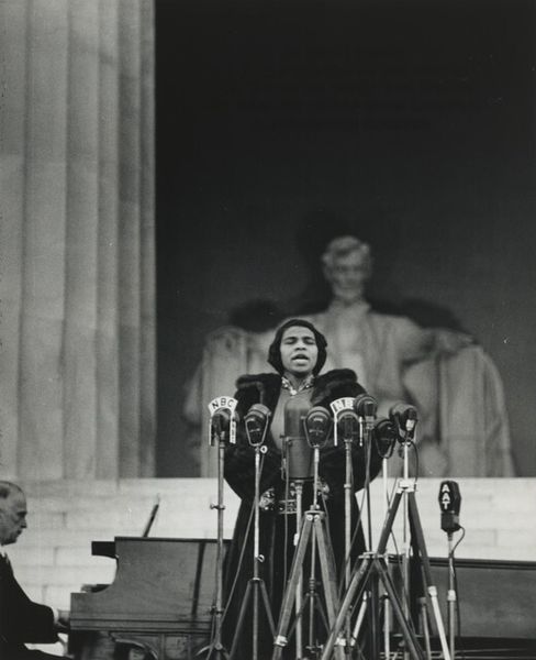 Curator: Rosalind Solomon’s photograph, ERA March, Washington, DC, captures a compelling moment. Look at the materiality, the tones rendered on this gelatin silver print. Editor: It feels patriotic, yet…ordinary. The woman's expression is determined, not triumphant. What do you think it tells us about that movement? Curator: It complicates any singular narrative. This image highlights the individuals involved in political action, the labor of protesting, and the very real stakes for these marchers. Editor: The flags she carries feel almost like burdens, reflecting the struggles for equality symbolized by the ERA movement itself and how it was received. Curator: Precisely. Solomon shows us how political movements are built on the backs of everyday people, their efforts and commitment. Editor: A reminder that history is made not just in grand gestures, but in the consistent work of ordinary lives.