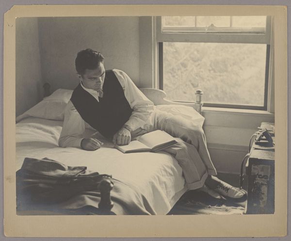 Curator: This photograph by Alfred Stieglitz, simply titled "Georgia O'Keeffe," could have been taken any time between 1918 and 1934. Editor: What strikes me immediately is the intimacy—the quiet intensity of O'Keeffe at work, completely absorbed in her own creative world. The light seems to wrap around her, pulling her in. Curator: Stieglitz had a way of doing that, didn’t he? The monochrome rendering really accentuates the textures—the chunky knit of her sweater, the rough ground she’s sitting on, the smooth paper. There’s a real focus on materiality, despite the softening effect of the light. Editor: Yes, you're right to highlight materiality here. Look at the watercolor set discarded on the ground, and the water jar next to the work in progress: It invites us to reflect on art-making, celebrating it as both cerebral creation and skillful manipulation of humble material objects. It isn't the romantic tortured artist but, instead, something much more like skillful and patient labour. Curator: I always read his portraits of O'Keeffe as dialogues—between artist and muse, photographer and subject. But beyond that, it's about the dance of perception itself. Is Stieglitz showing us *Georgia O'Keeffe,* or is he showing us what he *sees* in Georgia O'Keeffe? Perhaps he wanted the viewers to realize what the production of images and of representation is truly about. Editor: Precisely. It’s a compelling point—thinking of these images as collaborations in which O'Keeffe performs creative self-representation while simultaneously serving as raw material for Stieglitz's photographic experiments. There’s definitely an exchange of power at play. Curator: Absolutely. And in this particular shot, I get a real sense of her grounding – literally and figuratively. She's connected to the earth, rooted in her work. It's a very powerful statement, however quietly made. Editor: Indeed. It’s remarkable how such a simple composition, made with relatively modest means, can speak so powerfully about art, labor, representation, and human connection. There's real substance here, both visually and conceptually.