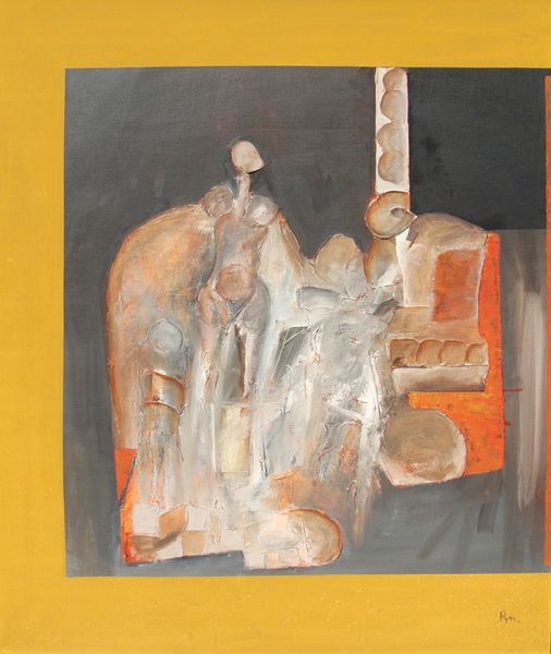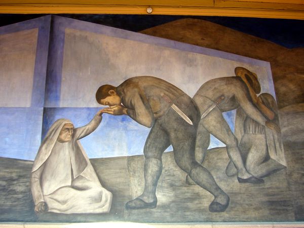 Editor: So, this mural, "Call to Revolution and Table of Universal Brotherhood," was painted in 1931 by José Clemente Orozco, using the fresco technique. At first glance, it feels… solemn, almost like a prelude to something momentous. What do you see in this piece? Curator: Immediately, I'm drawn to the hands. Notice the gesture of giving, the hand outstretched. It echoes centuries of symbolic imagery – think of religious paintings where such gestures represent divine grace or the passing of knowledge. But here, it’s a worker, offering something earthly – tools, sustenance, or perhaps solidarity. What is he passing on, and why? Editor: Maybe the bread on the table symbolizes a more communal sharing of resources? Curator: Precisely. Food is a recurring motif, linking back to ideas of shared labour and social justice. The table itself acts as a modern-day altar. In Western painting tradition the table could represent abundance or ritual but here, juxtaposed against the figures seemingly on the precipice of revolution, I think it asks us where, and to whom, that abundance is allocated, doesn't it? Editor: That's thought-provoking. It's almost as if the figures and objects aren't just representing themselves but embodying larger historical or political forces. Curator: Exactly! Orozco pulls from our collective memory of religious art, reshaping those familiar symbols into revolutionary statements. He asks, how can we forge a new collective memory centered on labor and shared humanity? Editor: I see how this reading transforms my initial sense of solemnity into something much more…active. It's not just a prelude, it's a call to action! Curator: Indeed! Orozco uses powerful, pre-existing imagery to speak to our deepest psychological needs and create potent new narratives. Hopefully, this brief time with the work has given you something to reflect on. Editor: Definitely. I’ll never look at a table in a painting the same way again. Thanks!