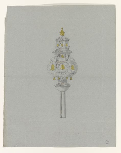 Curator: Here at the Metropolitan Museum of Art, we have an intriguing piece: a 19th-century design for an oil lamp. The anonymous artist rendered it in watercolor, and the drawing also has print elements. Editor: It’s certainly detailed. My first thought is that it's more like a miniature cathedral than a lamp, really—ornate, almost aggressively so. What exactly was it intended for? Curator: Its style harkens back to the Gothic period, which experienced a revival in the 19th century. These design drawings played a key role in how historical styles were reinterpreted and implemented in contemporary society. They would circulate among workshops and become the foundation for commissioning further design objects, feeding the demand from an increasingly affluent middle class for historically-inspired domestic goods. Editor: So, mass-produced gothic, if you will? I'm particularly drawn to the rendering of light in the glass sphere – that watercolor wash mimics the way the glass would both refract and diffuse the light, hinting at the materiality of its intended form. The designer clearly understands not only aesthetic styles, but also manufacturing and industrial considerations. Curator: Precisely. It points to a burgeoning industry focused on democratizing design, making luxury aesthetics available to a wider public beyond the aristocracy, fundamentally changing the accessibility to design. Editor: It also raises questions about artistic labor, doesn't it? The level of detail suggests meticulous handcraft, yet the intention seems to have been mass production. This creates a fascinating tension between the unique artisan skill required for the initial design and its replication in the market. Curator: A critical tension indeed. It embodies the push and pull of tradition and innovation that defines much of 19th-century artistic production. These lamps could have populated drawing rooms and public buildings, reshaping interior environments with readily-available symbols of history and authority. Editor: It’s remarkable how much social and industrial history can be gleaned from a single design for something as humble as an oil lamp. It moves past pure functionality. Curator: Indeed, by investigating its materials and the process of its creation, we learn as much about cultural ambition and the commercial marketplace as we do about aesthetic tastes.