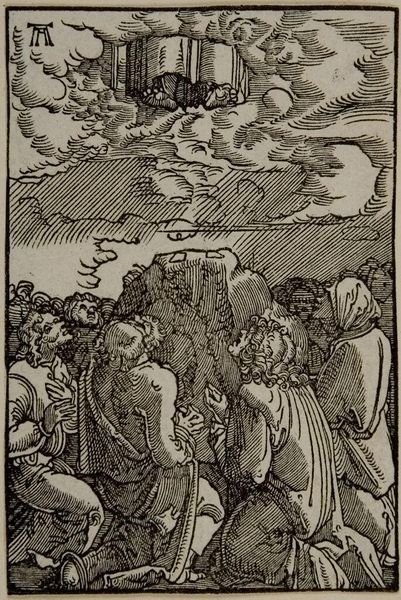 Editor: This woodcut, “The Ascension of Christ” by Albrecht Altdorfer, created sometime between 1508 and 1518, is striking in its almost frantic energy. The crowd below seems overtaken by the event. What can you tell us about this work’s place in history? Curator: Altdorfer was deeply embedded in the cultural and religious upheavals of the early 16th century. Notice how the ascension isn’t a serene, heavenly departure, but an almost violent expulsion. How does this portrayal speak to the anxieties around religious authority during the Reformation? Editor: That's an interesting point. The ascension often feels so triumphant and peaceful, but here, it feels unsettling, almost chaotic, which perhaps relates to anxieties around religious authority, as you stated. Do you think the medium – the woodcut itself – played a role in this effect? Curator: Absolutely. Woodcuts were accessible and reproducible, acting as a form of visual rhetoric aimed at a broad audience. Consider how Altdorfer’s choice of this readily available medium served to disseminate a particular vision of this central religious narrative. How might this have challenged the Church’s control over imagery and doctrine? Editor: So the accessibility of the woodcut democratized the image, but potentially stirred the pot in doing so. The way you frame it, the piece does seem less about simple faith and more about shifting power structures within the public sphere. Curator: Precisely. Altdorfer was participating in a wider cultural shift, leveraging visual media to engage with complex socio-political dynamics. He offers us a powerful reminder that art is rarely just art; it's also a reflection of the tensions and transformations that shape a society. Editor: I hadn't considered the work in this context before. Thanks! I’m walking away with a better sense of how the cultural landscape influences the message within art. Curator: Indeed, looking at art this way offers a richer understanding, and it can be pretty surprising!