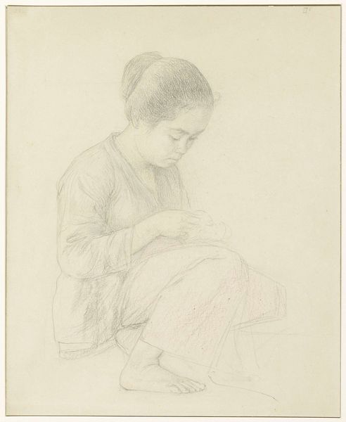 Frans Schwartz created this etching, "Kniplersken", in 1893. The immediate visual experience is one of intimacy and focus, achieved through the delicate lines and detailed rendering of a woman engrossed in her lacemaking. The composition centers on the interplay between the figure and her craft. Schwartz uses a close perspective, which positions us as intimate observers of her work. The subtle gradations of light and shadow, achieved through dense and sparse etching, create a palpable sense of texture. The woman’s posture, bent over her work, and the intricate tools suggest a world of focused labor. The artist invites us to interpret this scene as more than a simple depiction of labor. The meticulous detail and thoughtful composition elevates the lacemaker's work to a form of art, challenging the traditional hierarchy between fine arts and craft. By focusing on the texture and form, Schwartz prompts a deeper contemplation about the dignity and value of skilled craftsmanship.