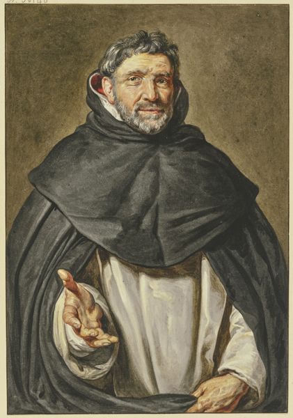 Curator: We are looking at a work made in 1621 by Lucas Vorsterman I. This is an engraving, an intaglio print, portraying Saint Ignatius of Loyola. Editor: It strikes me as an image steeped in somber reflection. The contrast of light and shadow emphasizes Loyola's contemplative stance amidst symbols of mortality and faith. There's a palpable sense of the baroque theatricality attempting to provoke an emotional response. Curator: Indeed, observe the meticulous detail Vorsterman achieves through the engraving technique. Note the dense network of lines which form the tonality and texture, animating Loyola’s face and the draped fabric behind him. He's praying, right, with the objects arranged upon the table beside him? A crucifix, skull, book, and rosary... Editor: The chosen symbols definitely provide cues toward a certain reading, absolutely. I immediately think about Loyola's role in the Counter-Reformation and the spiritual exercises he developed as a means of reinforcing Catholic doctrine against the rise of Protestantism. His intense piety could definitely also be seen as authoritarianism. Curator: Of course, Vorsterman, being from a Catholic center such as Antwerp, positions Loyola within the visual language of sanctity and erudition. His physical features, with a high forehead and receding hairline, mirror existing paintings of Loyola created soon after his death—these were consciously modeled after portraits of other intellectuals. Editor: The halo, too, can’t be ignored. And speaking of that table arrangement—those symbols of vanitas—book, rosary and skull—appear very deliberately arranged for maximal didactic effect. But does that, perhaps, overdetermine its viewing? Where's the possibility of seeing Loyola outside the paradigm of the church's official stance on his sanctity? Curator: The formal elements provide structure for understanding Loyola. Notice how he and Christ face the same direction; the implied diagonal is a powerful compositional component which can provide a clear, uncluttered experience to the viewer’s gaze. But maybe you’re pointing towards how these forms, as they are replicated through print culture, create larger networks of power? Editor: Exactly! Vorsterman's print doesn't just depict a historical figure; it actively participates in the construction of Loyola's image within specific ideological and historical parameters. I just keep coming back to those stark contrasts of black and white. How does the style ultimately frame or even determine our reading? Curator: Well, analyzing these formal elements enables a richer, more nuanced engagement with works like this. Editor: For me, this perspective encourages deeper reflection on art’s cultural implications and historical meanings.